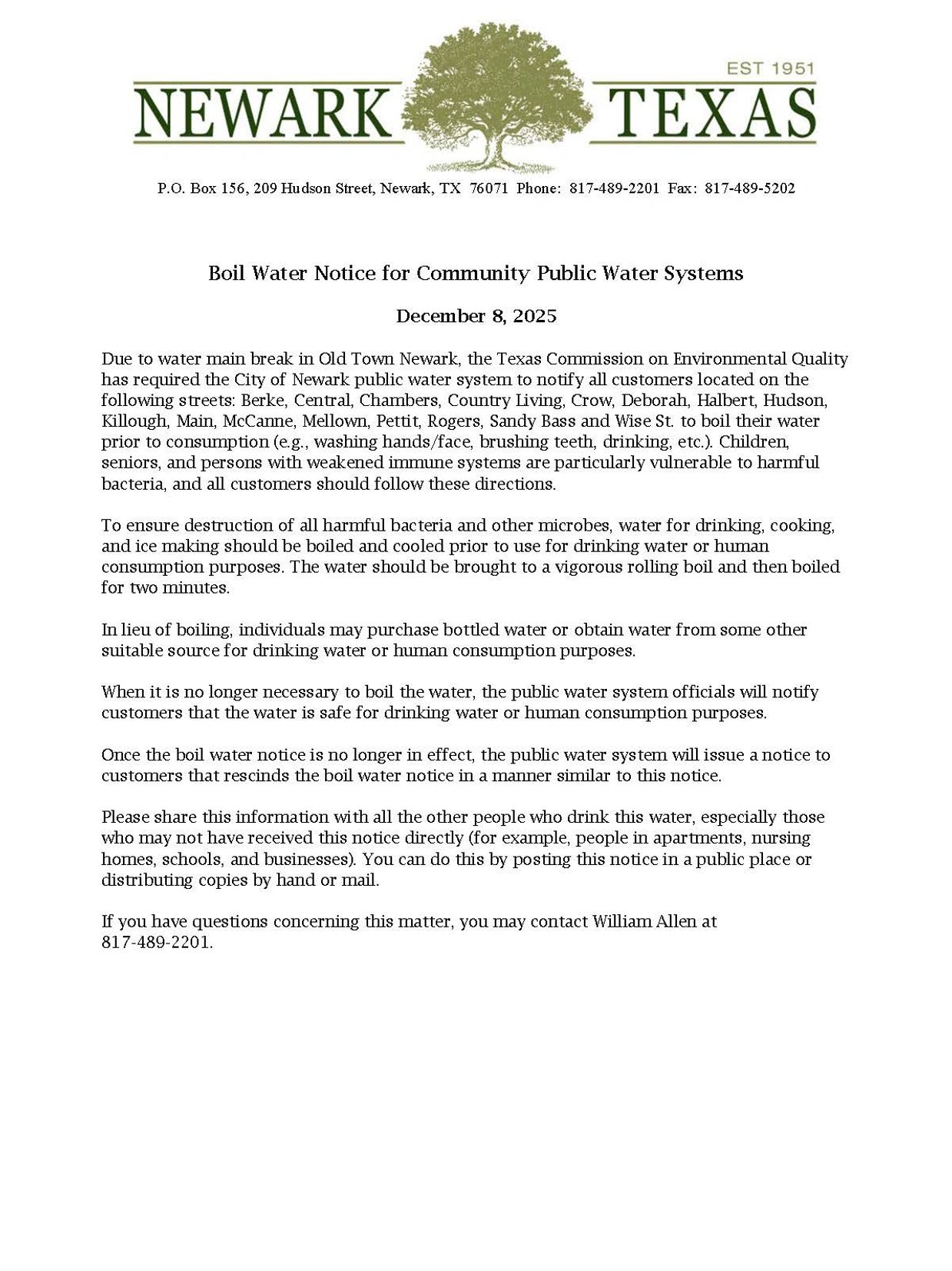 209 Hudson St. Newark, TX 76071 Phone: 817.489.2201 Fax: 817.489.5202 For Police, Fire, and Medical emergencies call 911